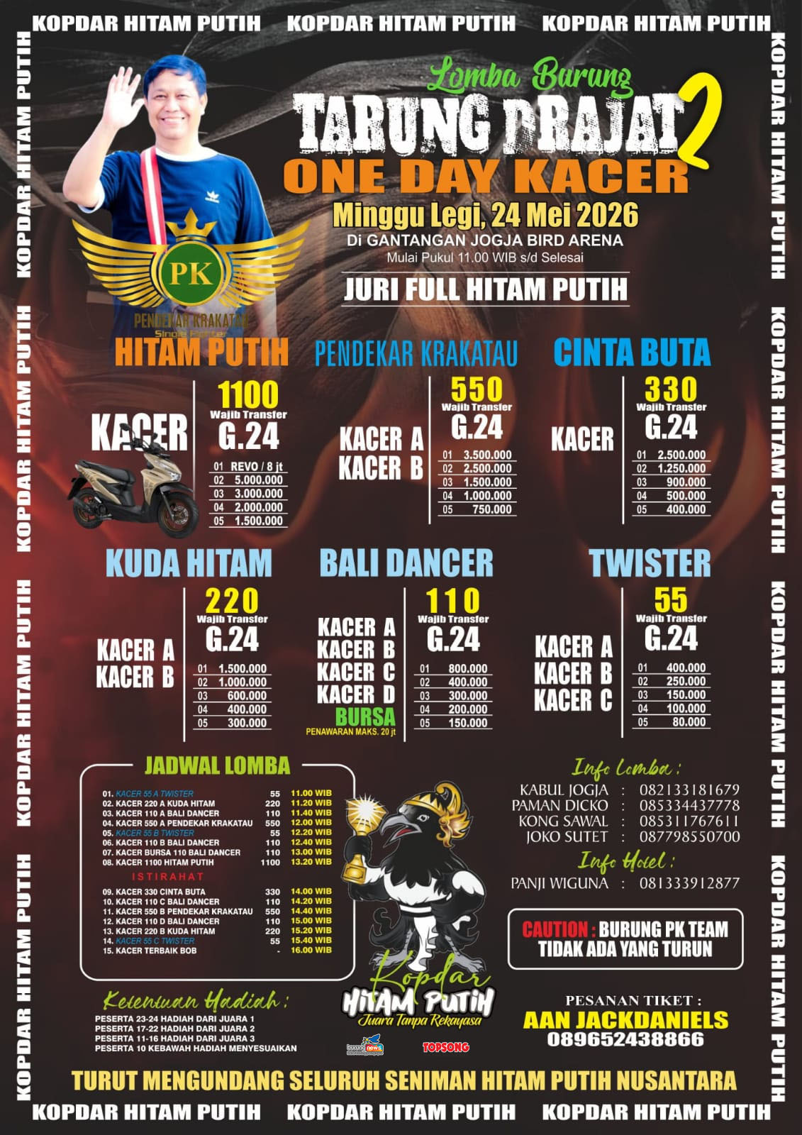 TARUNG DRAJAD 2 - ONE DAY KACER JOGJA BIRD ARENA, AREA DALAM MONUMEN JOGJA KEMBALI Minggu, 24 Mei 2026 Jam 10:00 Diliput oleh burungnews.com DOWNLOAD BROSUR
