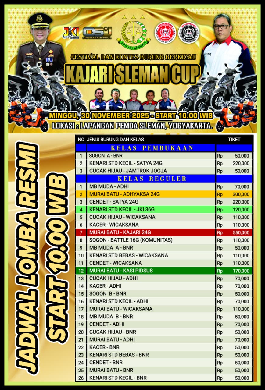 Kajari Sleman Cup akan berlangsung Minggu, 30 November 2025 di Lapangan Pemda Sleman, bersama BnR Indonesia. Penawaran menarik, adanya jaminan hadiah keluar mulai juara 1 berapa pun peserta, alias tanpa potongan, pada tiket 550K hadiah Yamah Gear dan 170K hadiah sepeda listrik.
