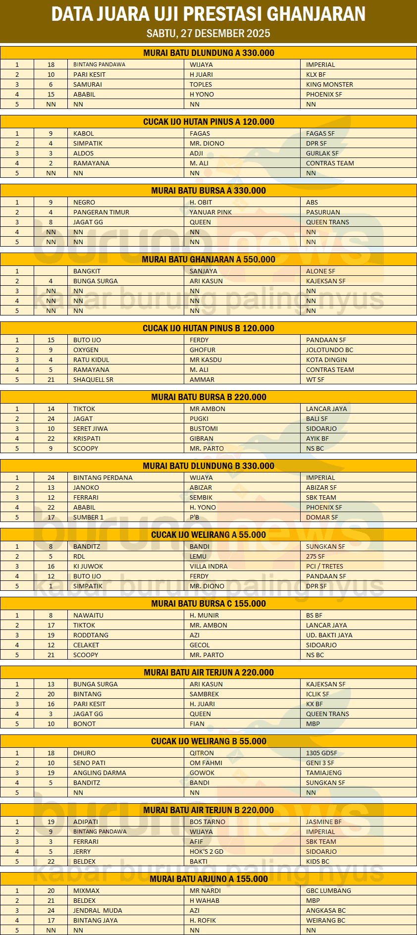 Even bertajuk Uji Prestasi di Ghanjaran Stadium berjalan sukses dan lancar. Di even ini juga terlihat Abah Tatuk, yang meski tidak bawa burung tapi mengaku sedang mencari burung yang harganya masih murah.