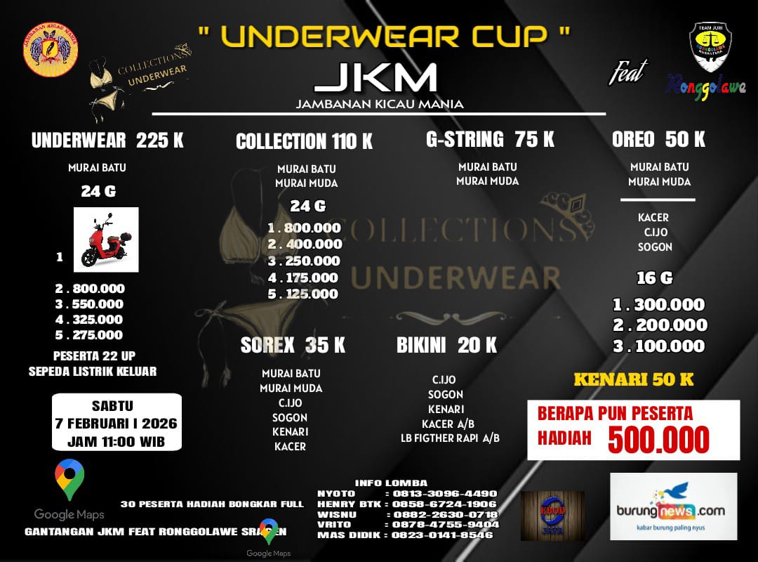 UNDERWEAR CUP GROMPOLAN, JAMBANAN, SIDOHARJO Sabtu, 07 Februari 2026 Jam 11:00 Diliput oleh burungnews.com DOWNLOAD BROSUR