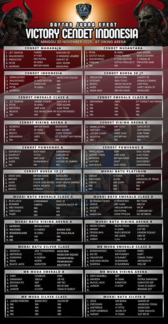 Resminya, gelar Cendet Terbaik Indonesia ini memang versi Viking Arena karena memenangkan kelas utama di Victory Cendet Indonesia, event cendet paling prestis di Viking Arena. Secara kemasan memang luar biasa, cendet dimainkan sampai 11 kali, termasui satu kelas bursa.