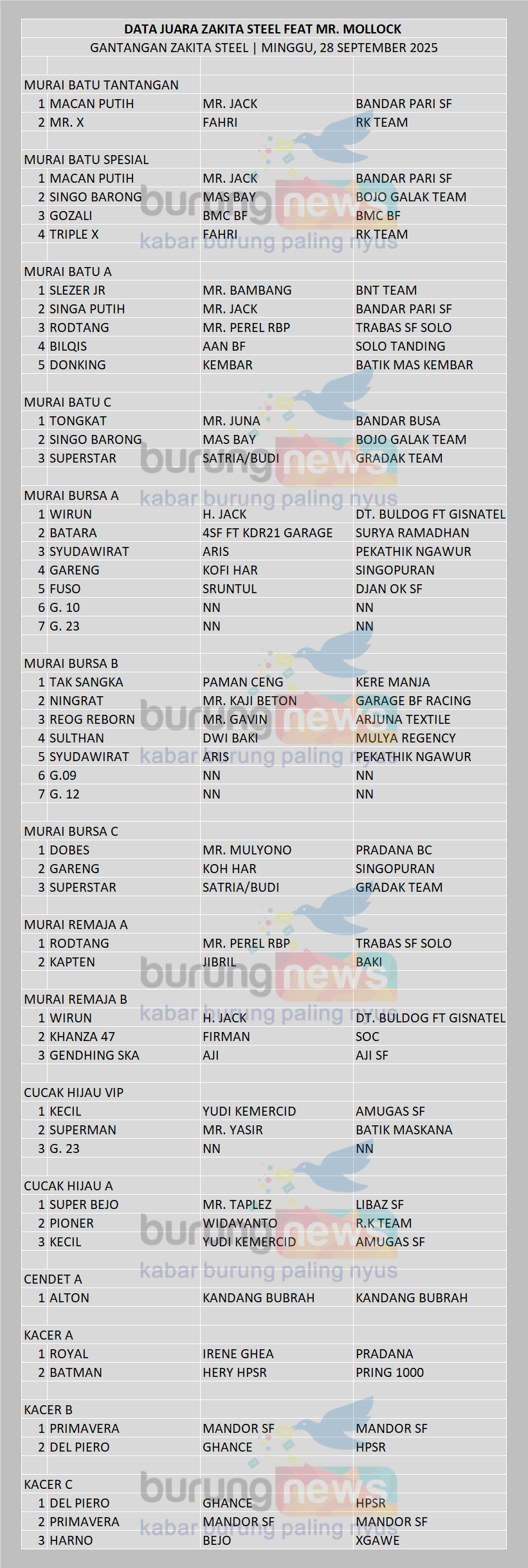 Zakita Steel Feat Mr. Mollock yang digelar pada Minggu, 28 September 2025 di Gantangan Zakita Steel, Baki, Sukoharjo berlangsung sukses. Event yang digelar dalam rangka merayakan hari ulang tahun Mr. Mollock ini diikuti pemain dari dalam dan luar kota.